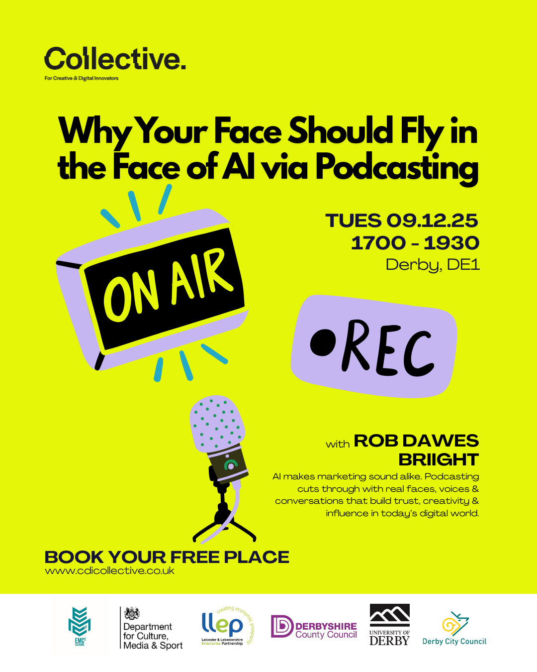 For our Derby launch we are joined by Rob Dawes, Creative Director at Briight, with his talk Why Your Face Should Fly in the Face of AI via Podcasting. It is sharp, practical and designed to get you thinking differently about how you show up in a world shaped by technology.